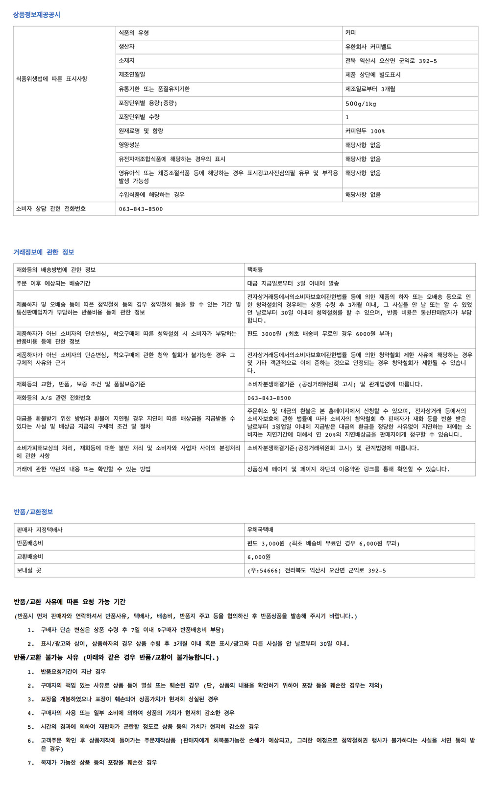 커피는 기호식품으로 그 특성상 개인의 취향이 다를 수 있으며 , 커피원두는 로스팅후 부터 산폐가 진행되며 반품후 재판매가 불가하므로 개봉 및 사용후 교환/환불 불가합니다.