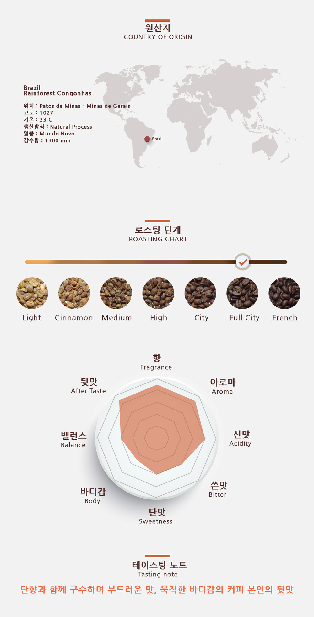 커피벨트가 준비한 브라질 레인포레스트 콩고냐스는 단향과 함께 구수하며 부드러우면서도 묵직한 바디감을 가져서 커피 본연의 맛을 즐기려는 고객에게 추천합니다.