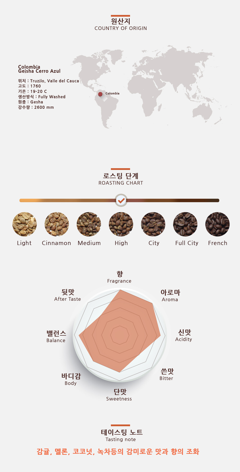 세계적으로 바리스타들에게 사랑받는 콜롬비아 세로 아줄 게이샤는 파나마 게이샤와 견주어도 결코 뒤지지 않으며 콜롬비아의 Cauca지방 Cerro Azul 농장에 생산됩니다.